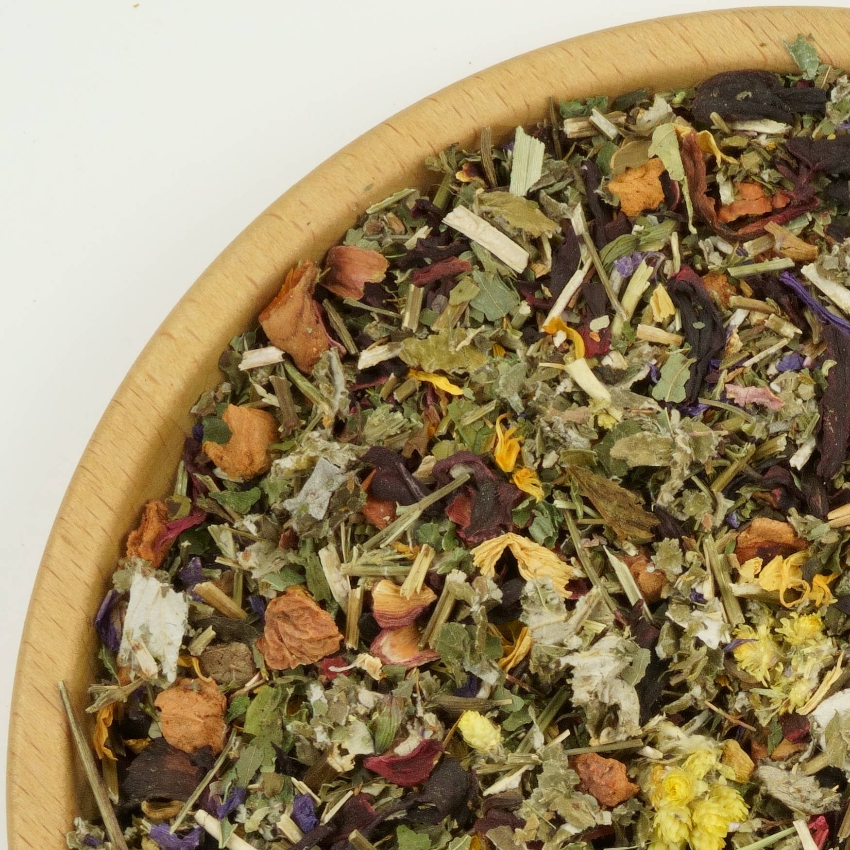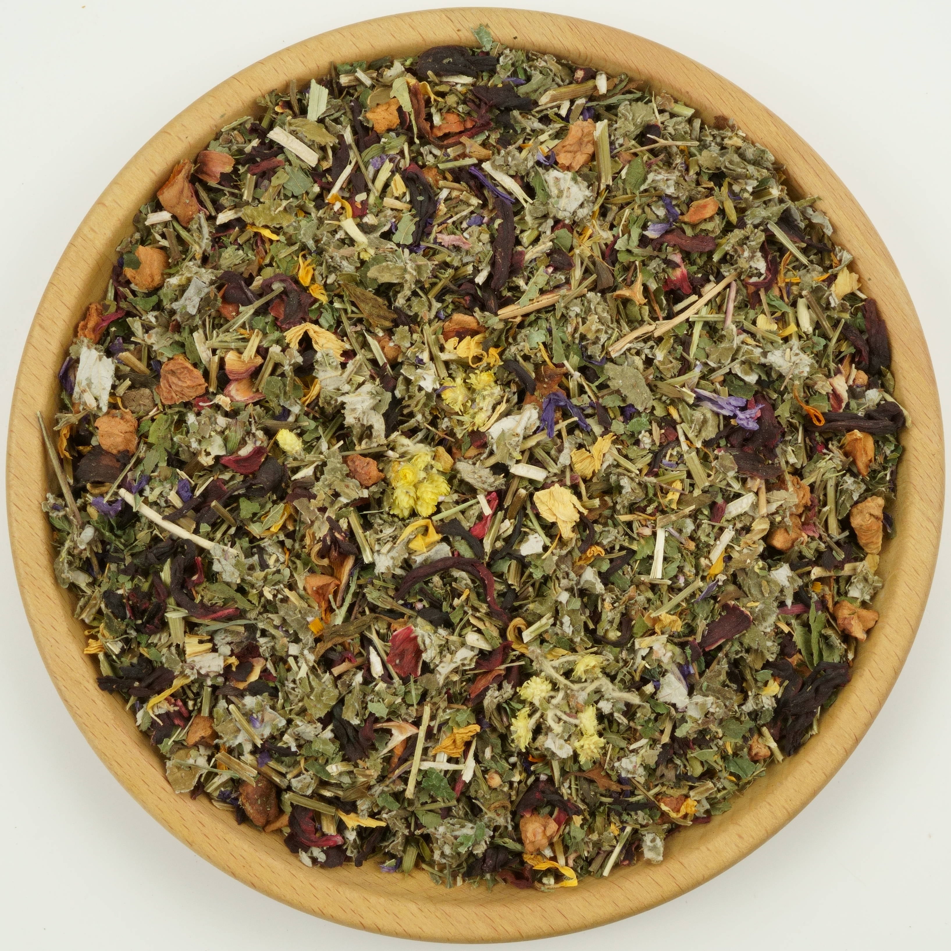 Hibiskusblüten, Melisse, Apfel, Himbeerblätter, Brombeerblätter, Pfefferminze, Heidekraut, Mädesüßkraut, Hagebuttenkerne, Malvenblüten blau, Ringelblumenblüten, Sonnenblumenblüten, Katzenpfötchenblüten.